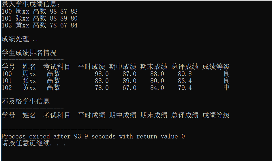 #include<stdio.h> #include<string.h> #define N 3 typedef struct student{ int id; char name[20]; char subject[20]; float perf; float mid; float final; float total; char level[10]; }STU; void input(STU[],int); void calc(STU[],int); int fail(STU[],STU[],int); void sort(STU[],int); void print(STU[],int); int main(){ STU st[N],fst[N]; int k; printf("录入学生成绩信息:\n"); input(st,N); printf("\n成绩处理...\n"); calc(st,N); k=fail(st,fst,N); sort(st,N); printf("\n学生成绩排名情况\n"); print(st,N); printf("\n不及格学生信息\n"); print(fst,k); return 0; } //输入学生信息 void input(STU s[],int n){ int i; for(i=0;i<n;i++) scanf("%d %s %s %f %f %f",&s[i].id, &s[i].name,&s[i].subject,&s[i].perf,&s[i].mid,&s[i].final); } //计算总评和等级 void calc(STU s[],int n){ int i; for(i=0;i<n;i++){ s[i].total=s[i].perf*0.2+s[i].mid*0.2+s[i].final*0.6; if(s[i].total>=90) strcpy(s[i].level,"优"); else if(s[i].total>=80&&s[i].total<90) strcpy(s[i].level,"良"); else if(s[i].total>=70&&s[i].total<80) strcpy(s[i].level,"中"); else if(s[i].total>=60&&s[i].total<70) strcpy(s[i].level,"及格"); else strcpy(s[i].level,"不及格"); } } //不及格学生统计 //数组s存放的是所有学生信息,数组t存放不及格学生信息,n是数组s中元素的个数 //函数返回值:返回的是不及格人数 int fail(STU s[],STU t[],int n){ int i,k=0; for(i=0;i<n;i++) if(s[i].total<60) t[k++]=s[i]; return k; } //根据总评成绩对学生记录信息排序 //使用的是冒泡排序法 void sort(STU s[],int n){ int i,j; STU temp; for(i=0;i<n-1;i++) for(j=0;j<n-i-1;j++) if(s[j].total<s[j+1].total){ temp=s[j]; s[j]=s[j+1]; s[j+1]=temp; } } //输出学生信息 void print(STU s[],int n){ int i; printf("------------------\n"); printf("学号 姓名 考试科目 平时成绩 期中成绩 期末成绩 总评成绩 成绩等级\n"); for(i=0;i<n;i++) printf("%-5d %-7s%-10s %7.1f %7.1f %7.1f %7.1f %10s\n",s[i].id, s[i].name,s[i].subject,s[i].perf,s[i].mid,s[i].final,s[i].total,s[i].level); }