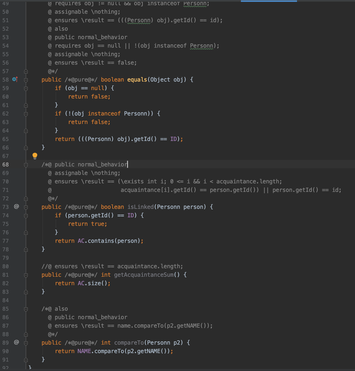 开始验证,由于官方JML位于接口中,为了便于对相关内进行验证,需重新将JML与实现代码放置在一起,本博客以Person接口的实现Personn为例,主要验证的三个方法,