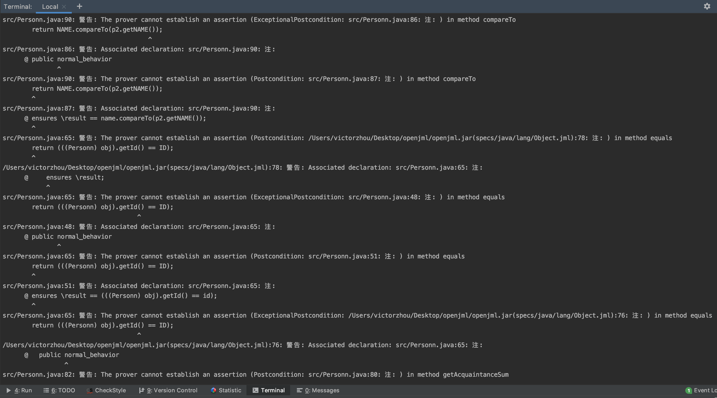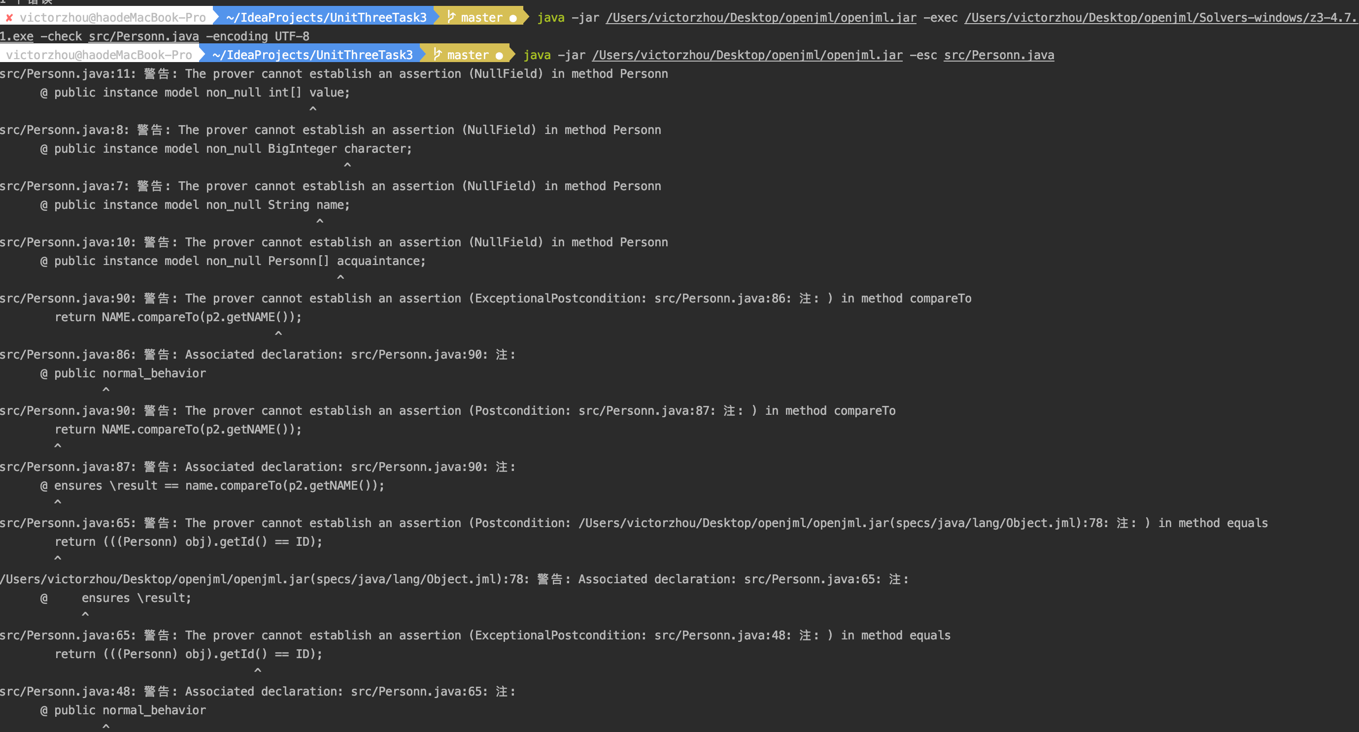 java -jar MYPATH/openjml.jar -exec MYPATH/openjml/Solvers-windows/z3-4.7.1.exe -check src/Personn.java -encoding UTF-8进行对JML语法进行检验,下面仅展示修改JML后无报错的情况。![]()