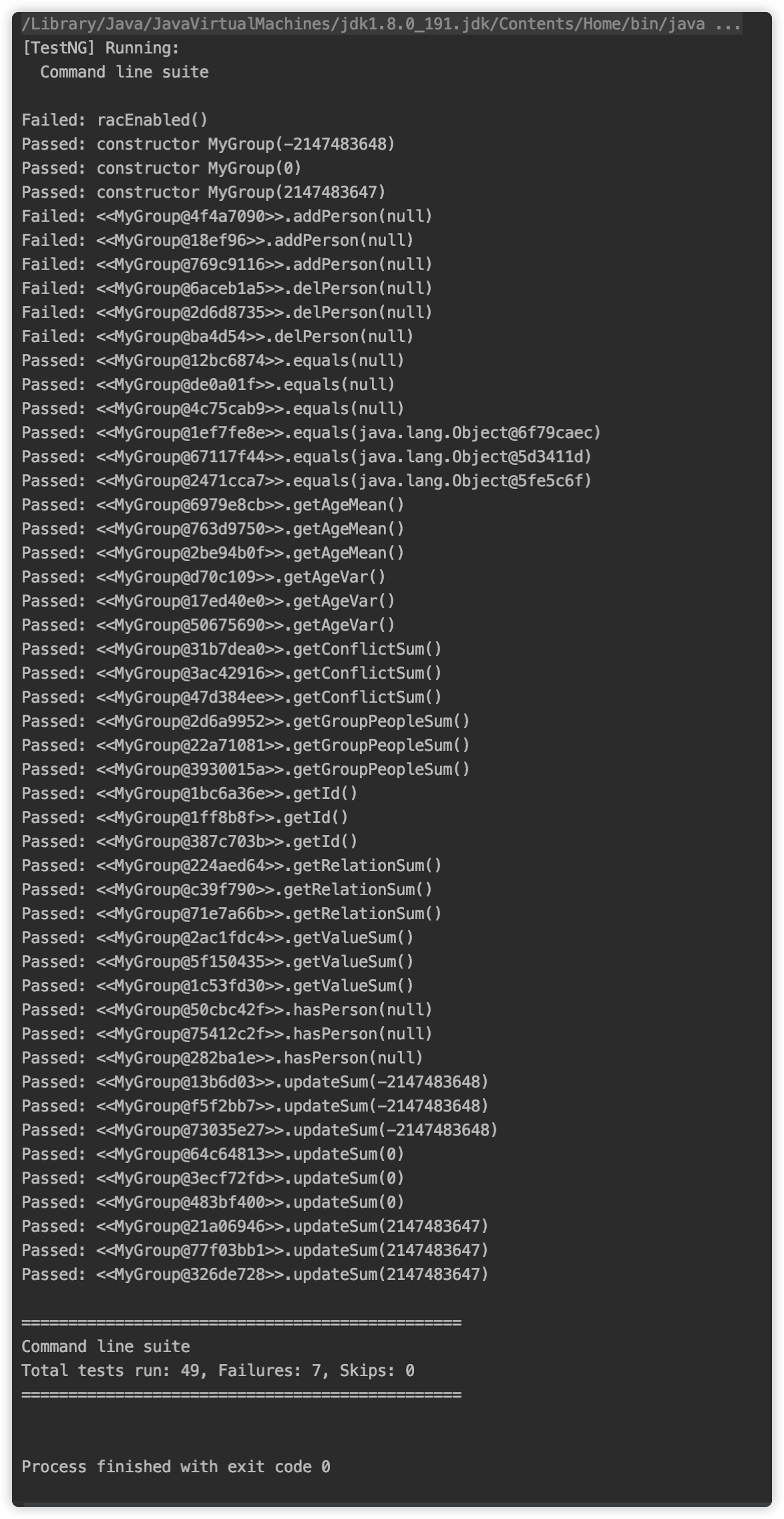 Integer.MAX_VALUE、Integer.MIN_VALUE或null,但也会生成一般的测试用例。分析结果发现,failed的测试点,是因为MyGroup类中addPerson(Person p)未判断p为null的情况,导致出错。但是在network调用之前我们已经避免了p为null的情况。所以程序本身从整体来说并没有出错。局部来看有一定问题。