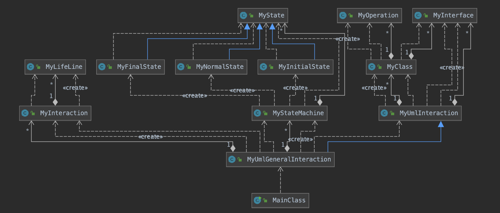 第一次作业任务是完成UML简单类图的解析,创建MyClass类,用于管理类相关数据,包括类的属性、类的方法、类实现的结构等所需要的数据。创建MyOperation类,用于管理方法相关数据,包括方法所包含的参数。创建MyInterface类,用于管理接口相关数据,包括接口的继承等数据。交互模式如下:![]()