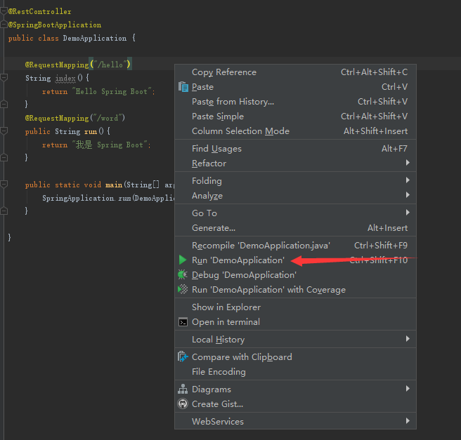 7. 运行项目,把它当成一个java类运行就可以了,右键菜单中选择,如图: