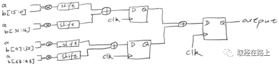 如上图,将两个64位的因数分别切成16位数据,由时钟驱动选择器在不同时刻选择不同的数据组合并在乘法器中相乘。然后把相乘的结果移位以后并与寄存器里的数据相加,然后当累加次数够了以后把累加结果作为64位乘法器的结果输出。关于电路还有如下几点说明。