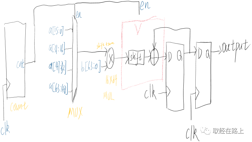 现在,考虑采用1.2节的优化方法下最极端的思路,即仅采用一个子乘法器进行设计。电路框图如下: