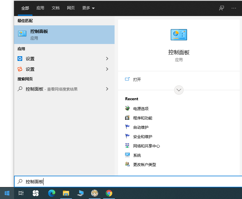 打开控制面板:按“开始”键后直接键盘输入“控制面板”搜索