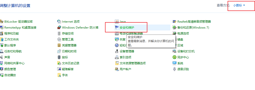 查看方式改“大图标/小图标”,打开“安全和维护”