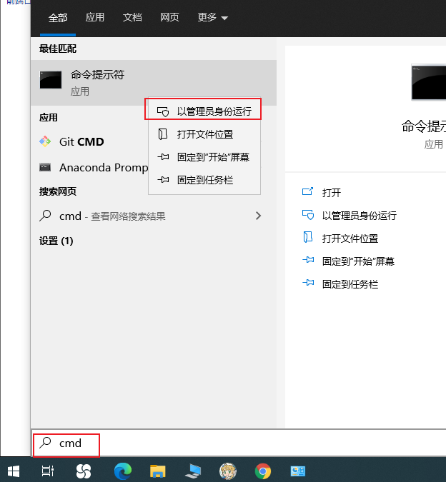 按“开始”键后键盘输入“cmd”,以管理员身份运行“命令提示符”