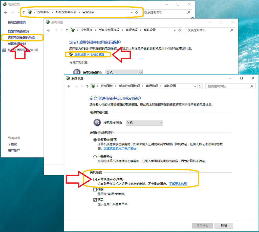 “更改当前不可用的设置” -> 取消勾选“快速启动”