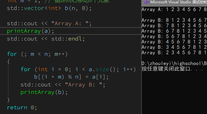 for (; m < n; m++) { for (int i = 0; i < a.size(); i++) b[(i - m % n + n) % n] = a[i]; // m % n 防止索引为负数 std::cout << "Array B: "; printArray(b); }