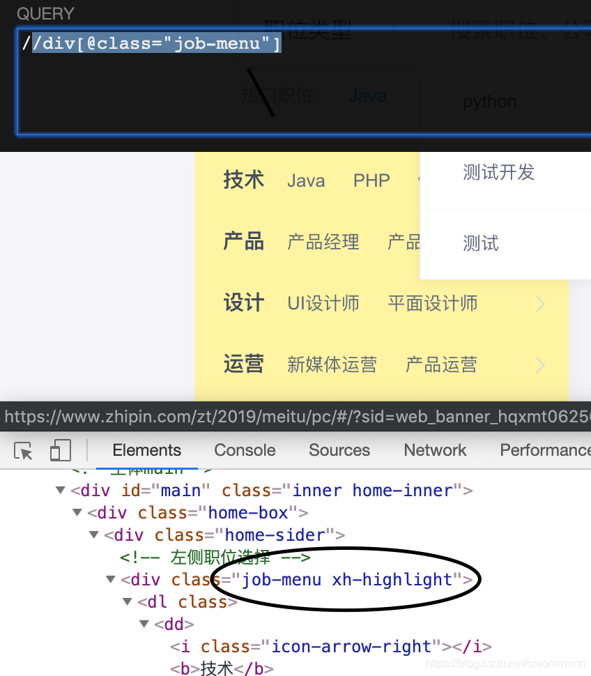 - //div[@class="job-menu"] 匹配class属性为job-menu 的div标签