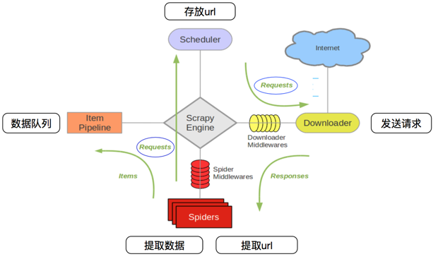 | Scheduler(调度器) | 队列,存放engine发送过来的request请求 | scrapy实现 |