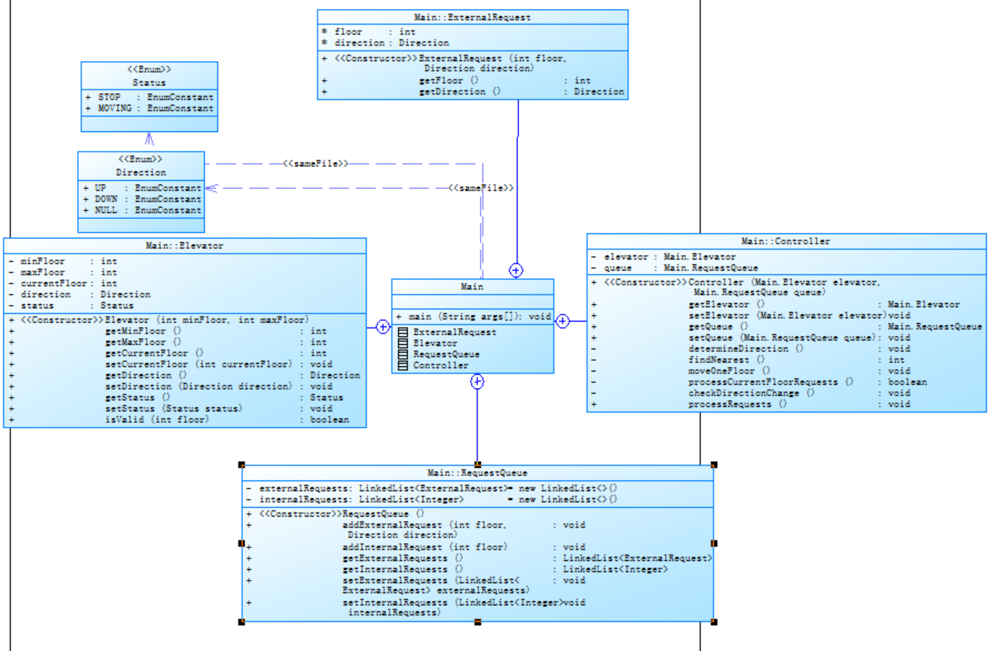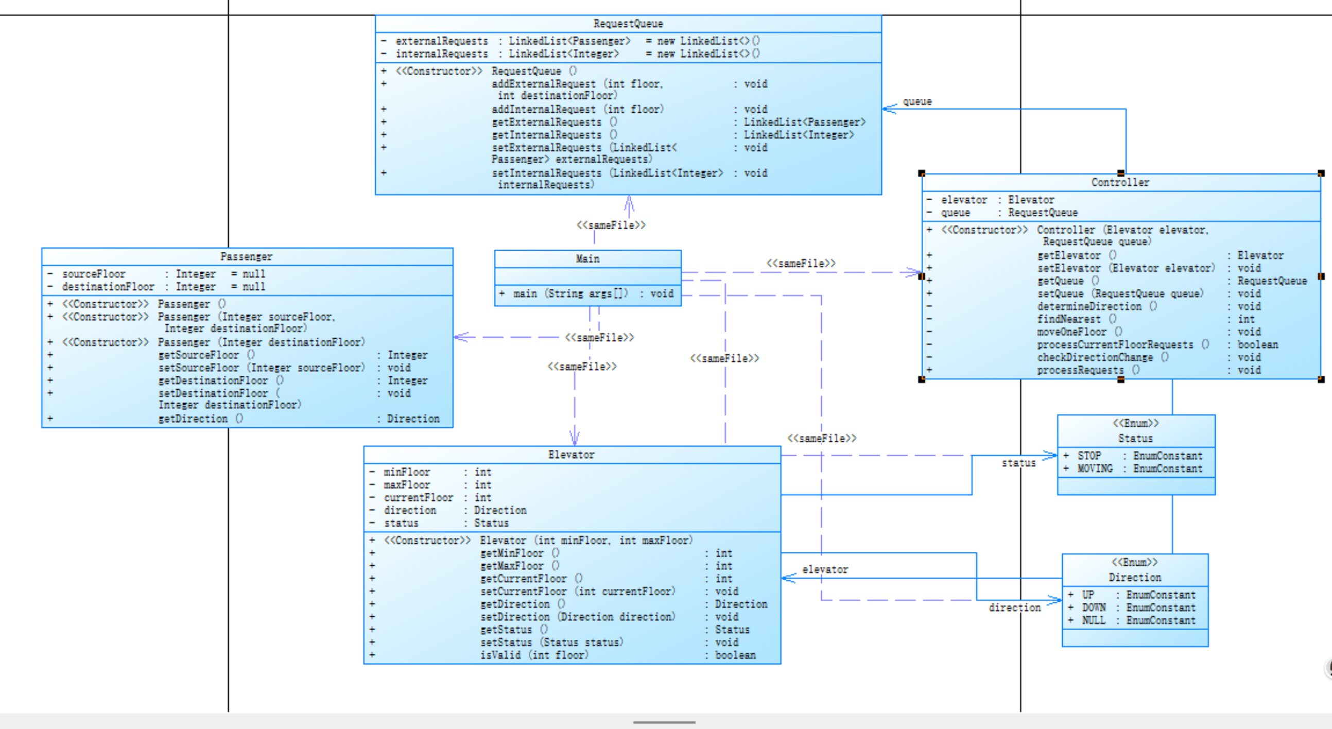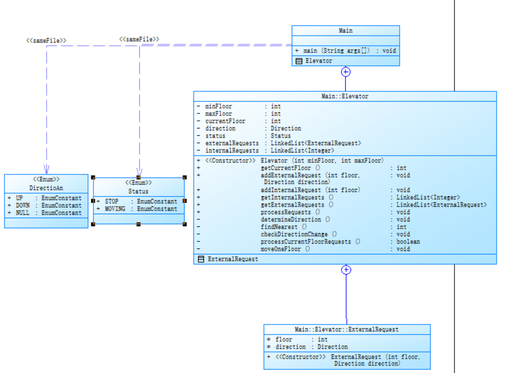 2.Elevator类,属性有minFloor,maxFloor,currentFloor(记录当前楼层),direction(记录电梯运行的方向),status(记录电梯运行状态),内部请求队列,外部请求队列。