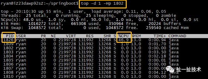 top -d 1 -Hp 1802,显示一个进程的线程运行信息列表