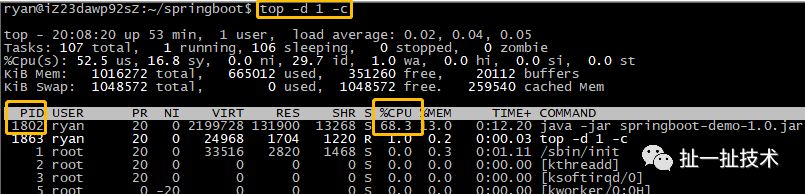 执行top -d 1 -c,每秒刷新一次,显示进程运行信息列表