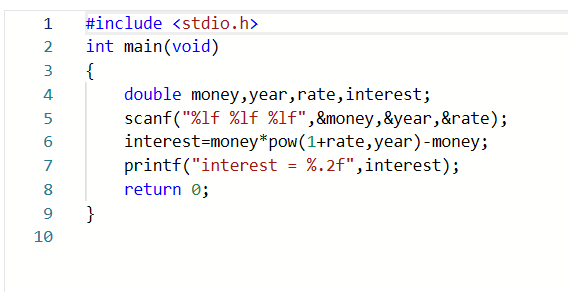 题目描述:本题目要求计算存款利息,计算公式为interest=money×(1+rate)year−money,其中interest为存款到期时的利息(税前),money是存款金额,year是存期,rate是年利率。