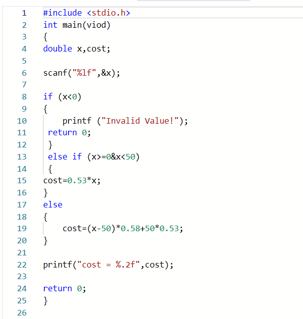 题目描述:为了提倡居民节约用电,某省电力公司执行“阶梯电价”,安装一户一表的居民用户电价分为两个“阶梯”:月用电量50千瓦时(含50千瓦时)以内的,电价为0.53元/千瓦时;超过50千瓦时的,超出部分的用电量,电价上调0.05元/千瓦时。请编写程序计算电费。