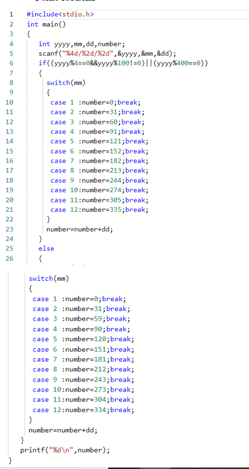 他的代码明显比我的长但是并不是复杂,他是在闰月和非闰月用了两遍switch语句判断选择我是直接在第二种情况下再去分类。