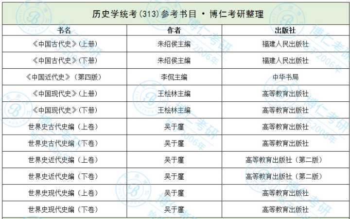 关于考研的学校还没确定下来,中国古代史属于学硕范畴只考三门:101思想政治理论、201英语一和专业课综合,对于跨考生来说,统考313历史学基础会更适合些,但是它的考试范畴比较广,中国史+世界史其中包括以下11本书籍: