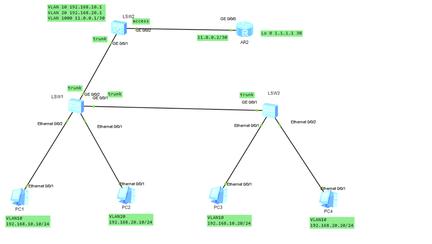 看图可知交换机1 3 都是划分了 VLAN 10 和VLAN20 两个区域