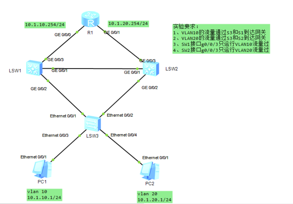配置SW1 【S1】stp mode mstp 选择MSTP模式 【S1】stp region-configuration 【S1-mst-region】region-name Huawei 【S1-mst-region】revision-level 1 【S1-mst-region】instance 1 vlan 10 设置实例1走VLAN10 【S1-mst-region】instance 2 vlan 20 【S1-mst-region】active region-configuration 【S1-mst-region】quite 【S1】stp instance 1 root primary 设置实例1为主 【S1】stp instance 2 root secondary 配置SW2 【S2】stp mode mstp 【S2】stp region-configuration 【S2-mst-region】region-name Huawei 【S2-mst-region】revision-level 1 【S2-mst-region】instance 1 vlan 10 【S2-mst-region】instance 2 vlan 20 【S2-mst-region】active region-configuration 【S2-mst-region】quite 【S2】stp instance 1 root secondary 【S2】stp instance 2 root primar 配置SW3 【S3】stp mode mstp 【S3】stp region-configuration 【S3-mst-region】region-name Huawei 【S3-mst-region】revision-level 1 【S3-mst-region】instance 1 vlan 10 【S3-mst-region】instance 2 vlan 20 【S3-mst-region】active region-configuration 【S3-mst-region】quite