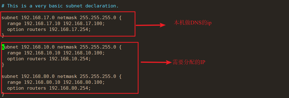 subnet 192.168.17.0 netmask 255.255.255.0 { #声明要分配的网段地址
