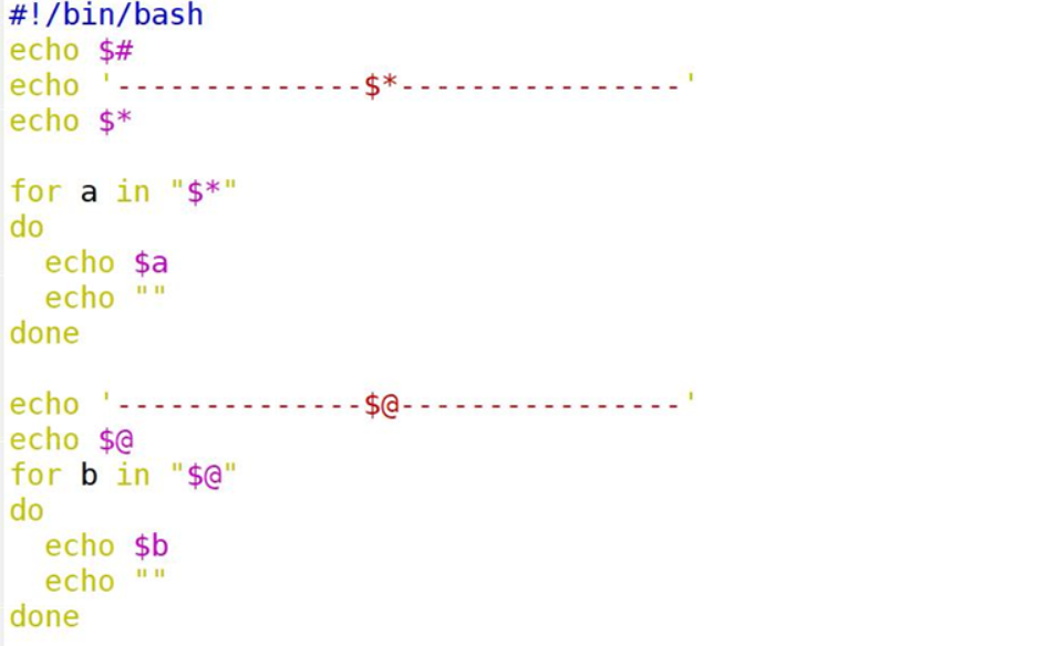 - $@:把各个参数加上双引号分隔成n份的参数列表,每个参数作为一个字符串返回,代表“$1” “$2” “$3” “$4”