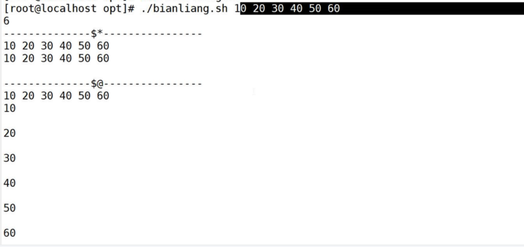 - $* :把所有参数看成以空格分隔的一个字符串整体(单字符串)返回,代表"$1 $2 $3 $4 "