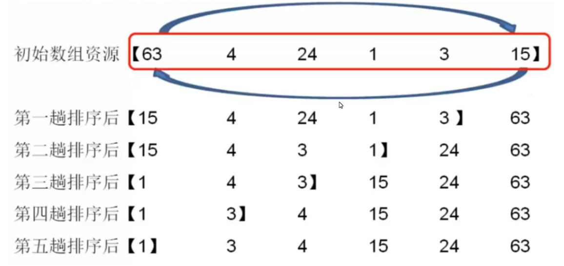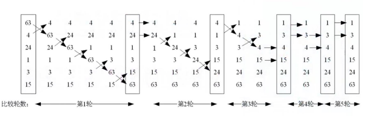 类似气泡上涌的动作,会将数据在数组中从小到大或者从大到小不断的向前移动。