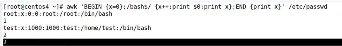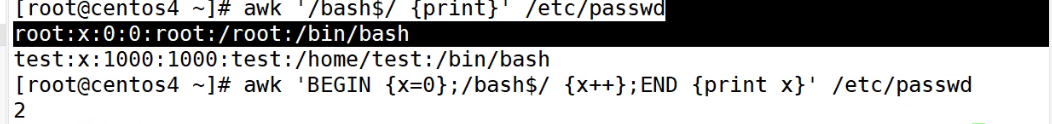 awk 'BEGIN {x=0};/\/bin\/bash$/{x++};END {print x}' /etc/passwd #统计以/bin/bash结尾的行数,等同于grep -c"/bin/bash$" /etc/passwd