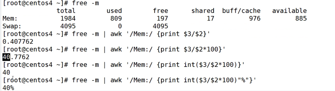 free -m| awk '/Mem:/ {print int ($3/ ($3+$4)*100) "%"}' #查看当前内存使用百分比