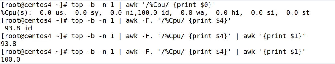 top -b -n 1 1 grep Cpu 1 awk -F ',' '{print $4}' 1 awk '{print $1}' #查看当前CPU空闲率,(-b -n 1表示只需要1次的输出结果)