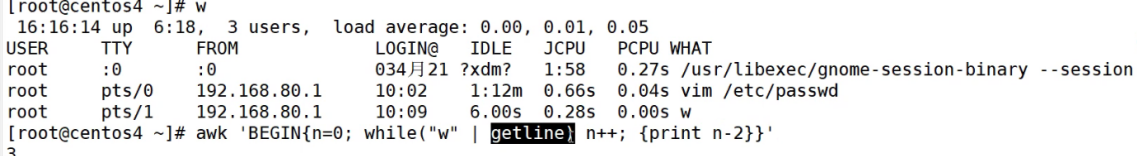 awk 'BEGIN {n=0 ; while ("w" | getline) n++ ; {print n-2}}' #调用w命令,并用来统计在线用户数