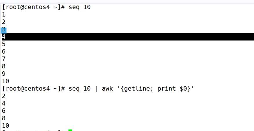 当getline左右有重定向符“<”或“|"时,getline则作用于定向输入文件,由于该文件是刚打开,并没有被awk读入一-行,只是getline读入,那么getline返 回的是该文件的第一-行,而不是隔行。