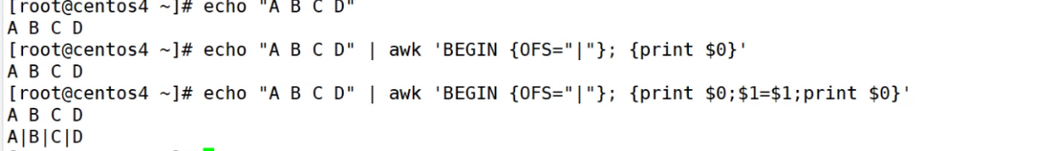 echo "A B C D" | awk ' {OFS="|";print $0;$1=$1;print $0} '