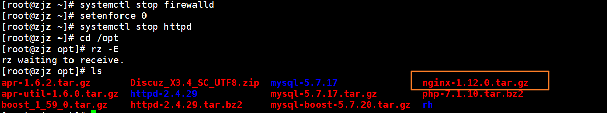 第一步:关闭防火墙,将安装nginx所需软件包传到/opt目录下