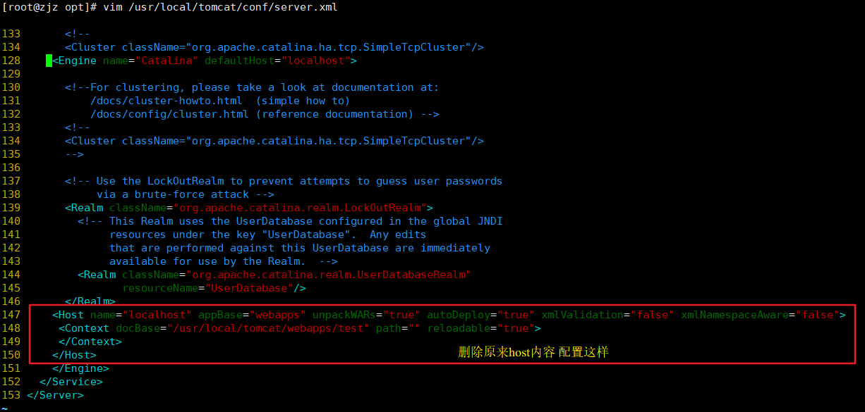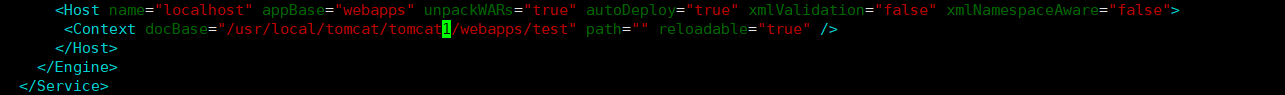 Tomcat1主配置删除前面的 HOST 配置,添加新的HOST配置(vim /usr/local/tomcat/tomcat1/conf/server.xml)