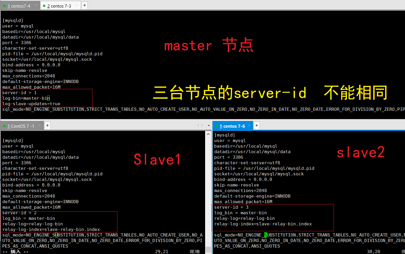 server-id = 2 #三台服务器的 server-id 不能一样