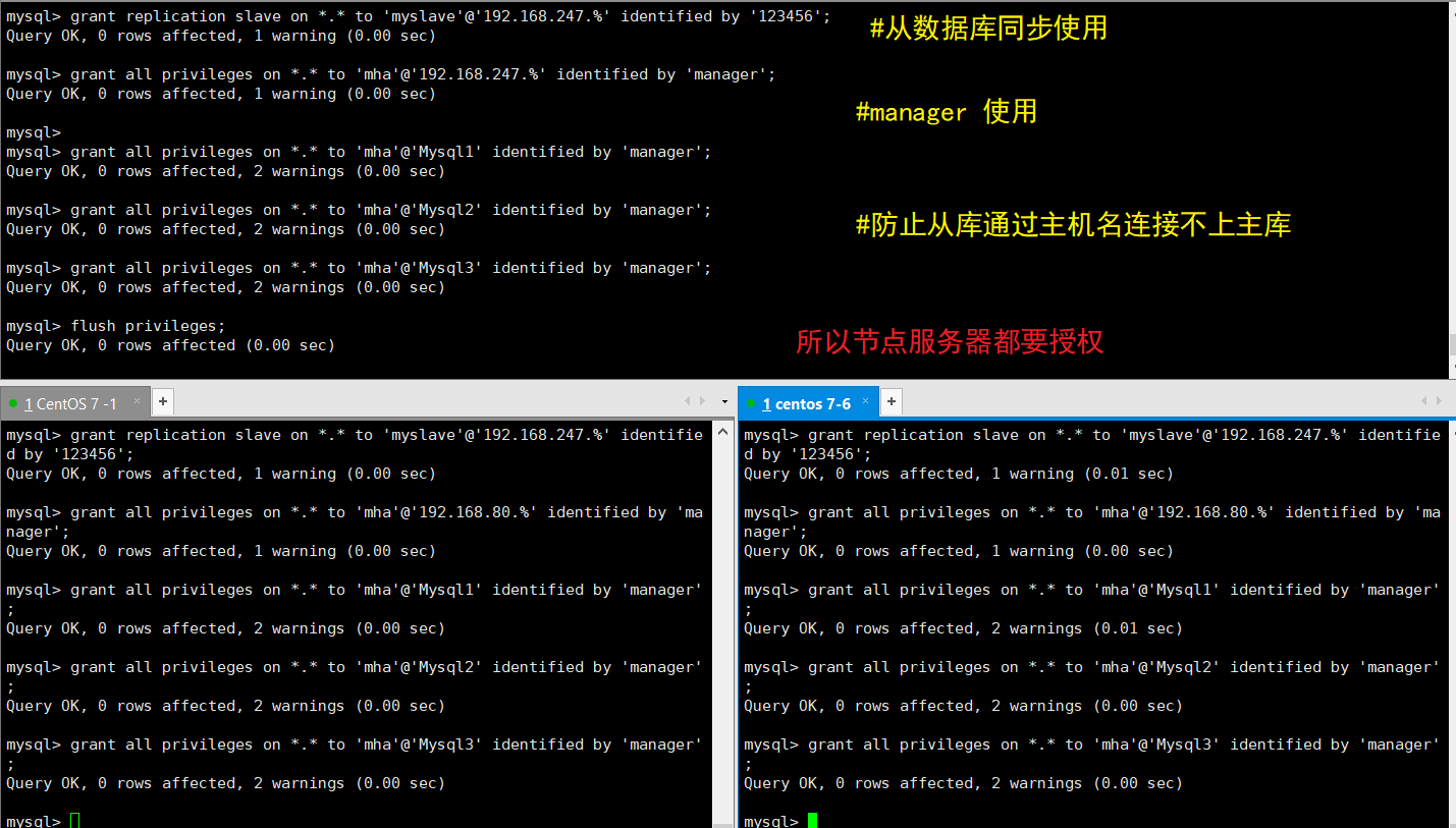 grant all privileges on *.* to 'mha'@'Mysql1' identified by 'manager'; #防止从库通过主机名连接不上主库