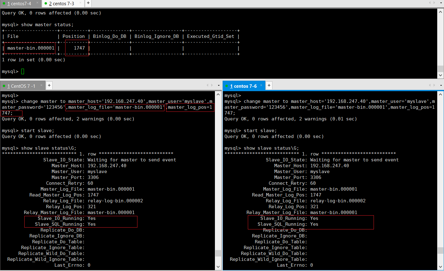 change master to master_host='192.168.247.40',master_user='myslave',master_password='123456',master_log_file='master-bin.000001',master_log_pos=1747;