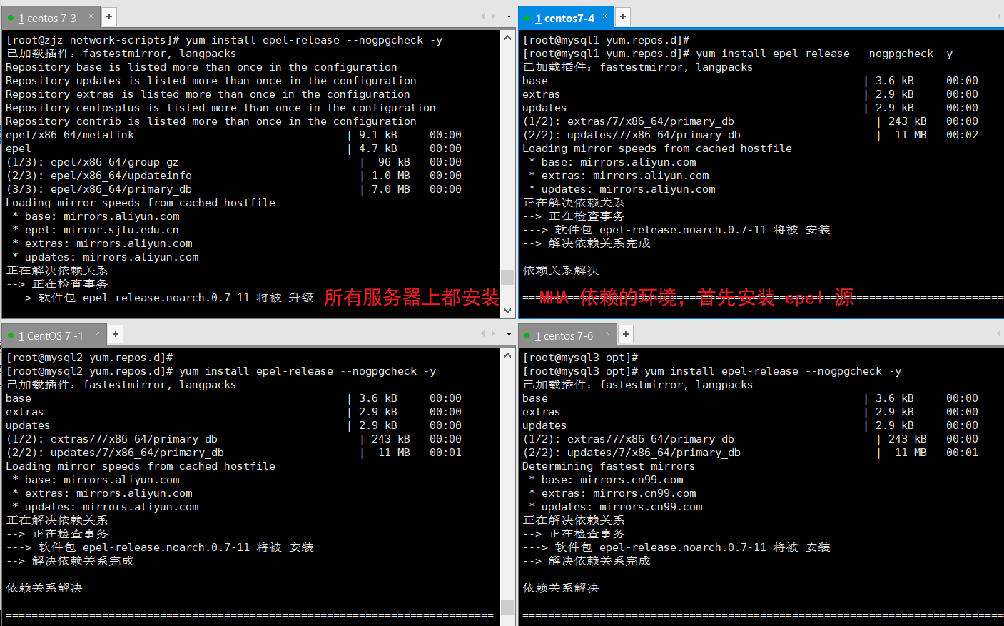 (1)所有服务器上都安装 MHA 依赖的环境,首先安装 epel 源