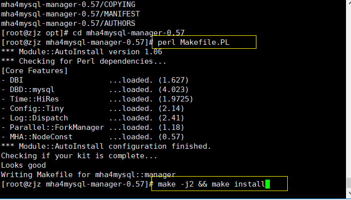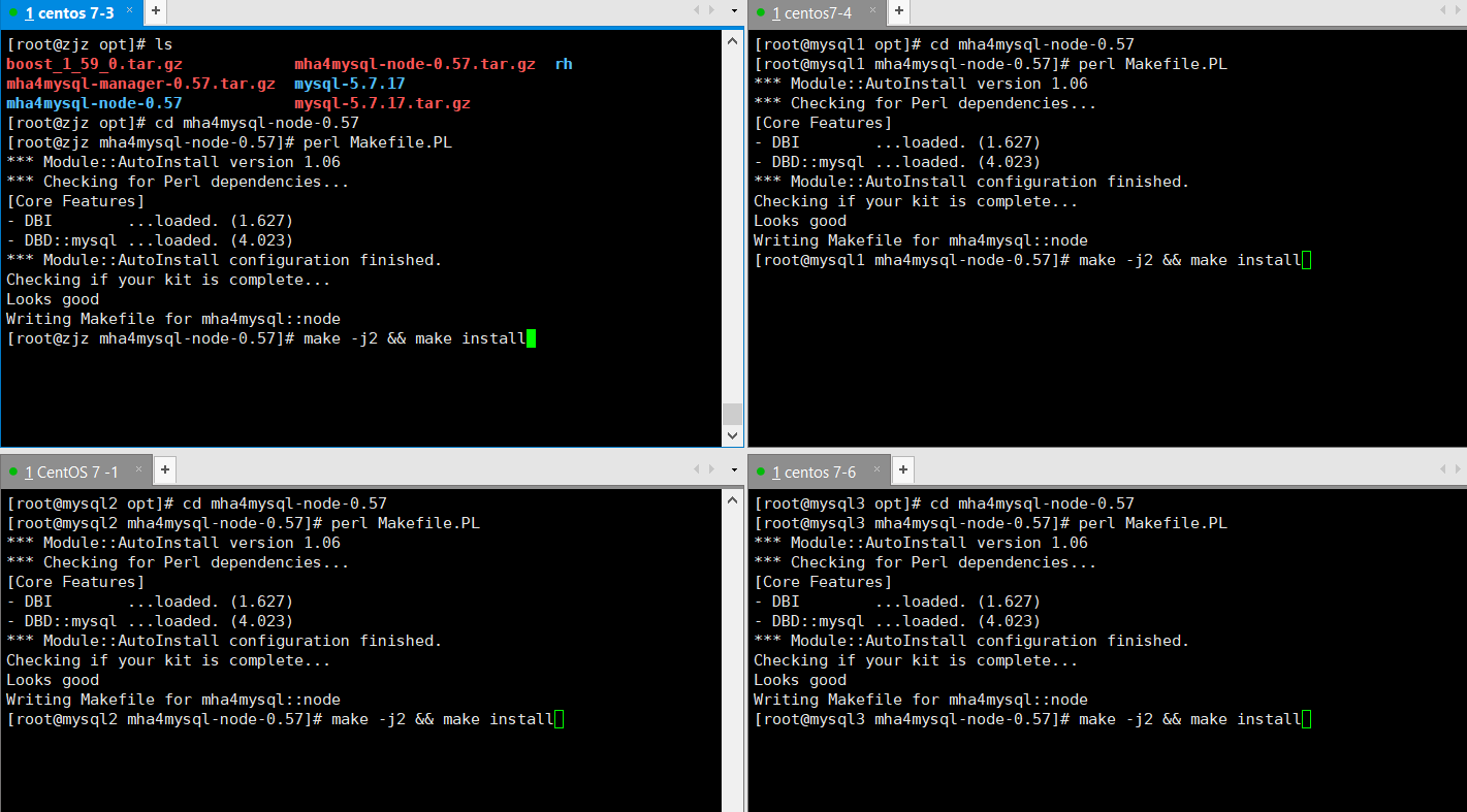 在所有服务器上必须先安装 node 组件,最后在 MHA-manager 节点上安装 manager 组件,因为 manager 依赖 node 组件。