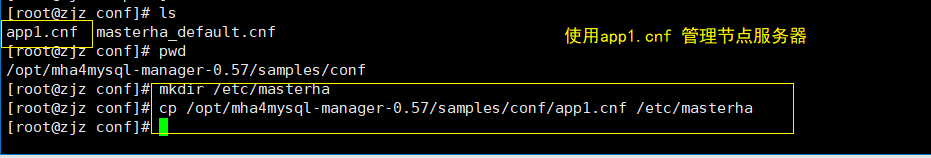 (4)创建 MHA 软件目录并拷贝配置文件,这里使用app1.cnf配置文件来管理 mysql 节点服务器