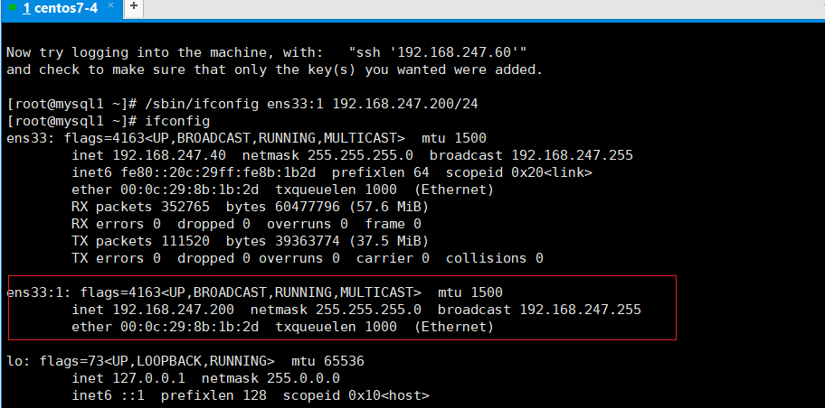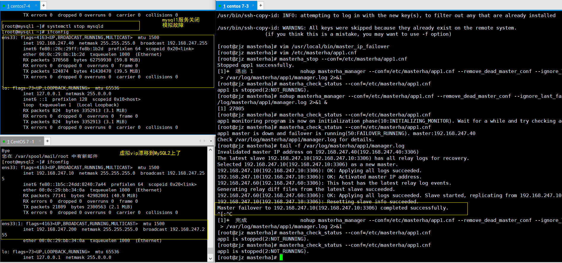 - 查看 Mysql1 的 VIP 地址 192.168.247.200 是否存在,这个 VIP 地址不会因为 manager 节点停止 MHA 服务而消失。