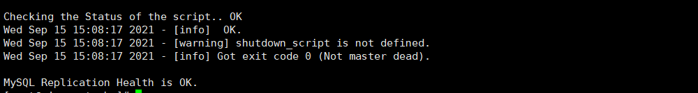 11.在 manager 节点上测试 mysql 主从连接情况,最后出现 MySQL Replication Health is OK 字样说明正常。如下所示。