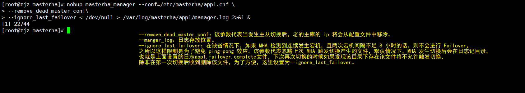 nohup masterha_manager --conf=/etc/masterha/app1.cnf --remove_dead_master_conf --ignore_last_failover < /dev/null > /var/log/masterha/app1/manager.log 2>&1 &