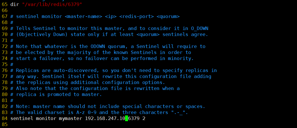 sentinel monitor mymaster 192.168.247.10 6379 2 #84行, 修改