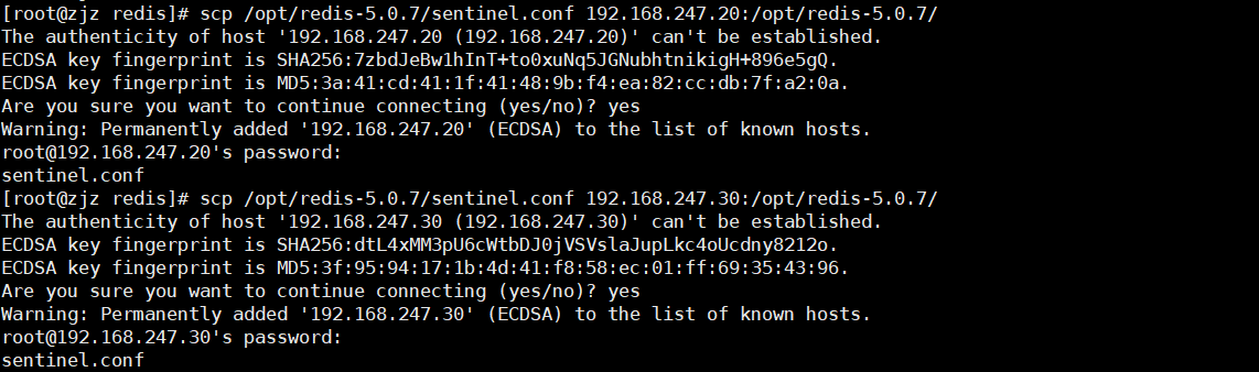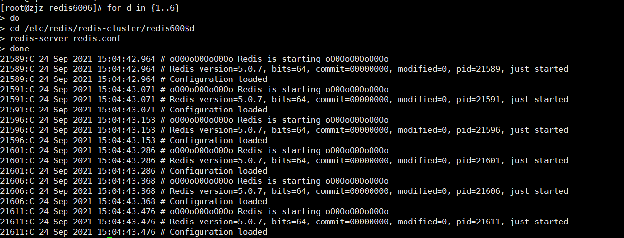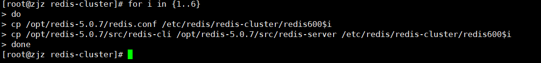 cp /opt/redis-5.0.7/src/redis-cli /opt/redis-5.0.7/src/redis-server /etc/redis/redis-cluster/redis600$i