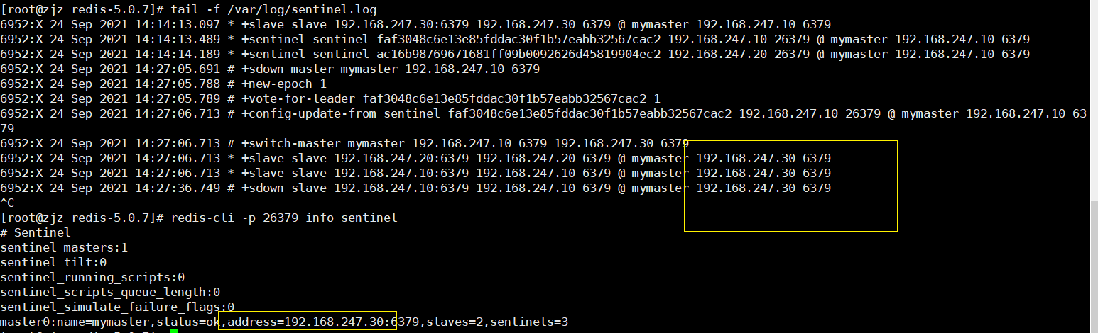master0:name=mymaster,status=ok,address=192.168.247.10:6379,slaves=2,sentinels=3