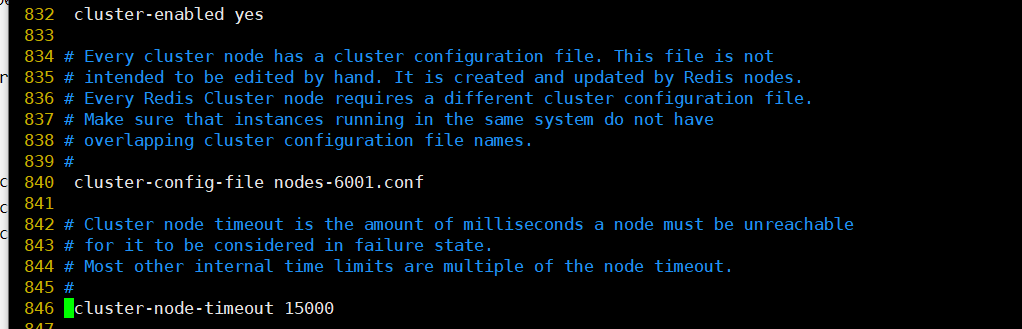 cluster-node-timeout 15000 #846行,取消注释群集超时时间设置