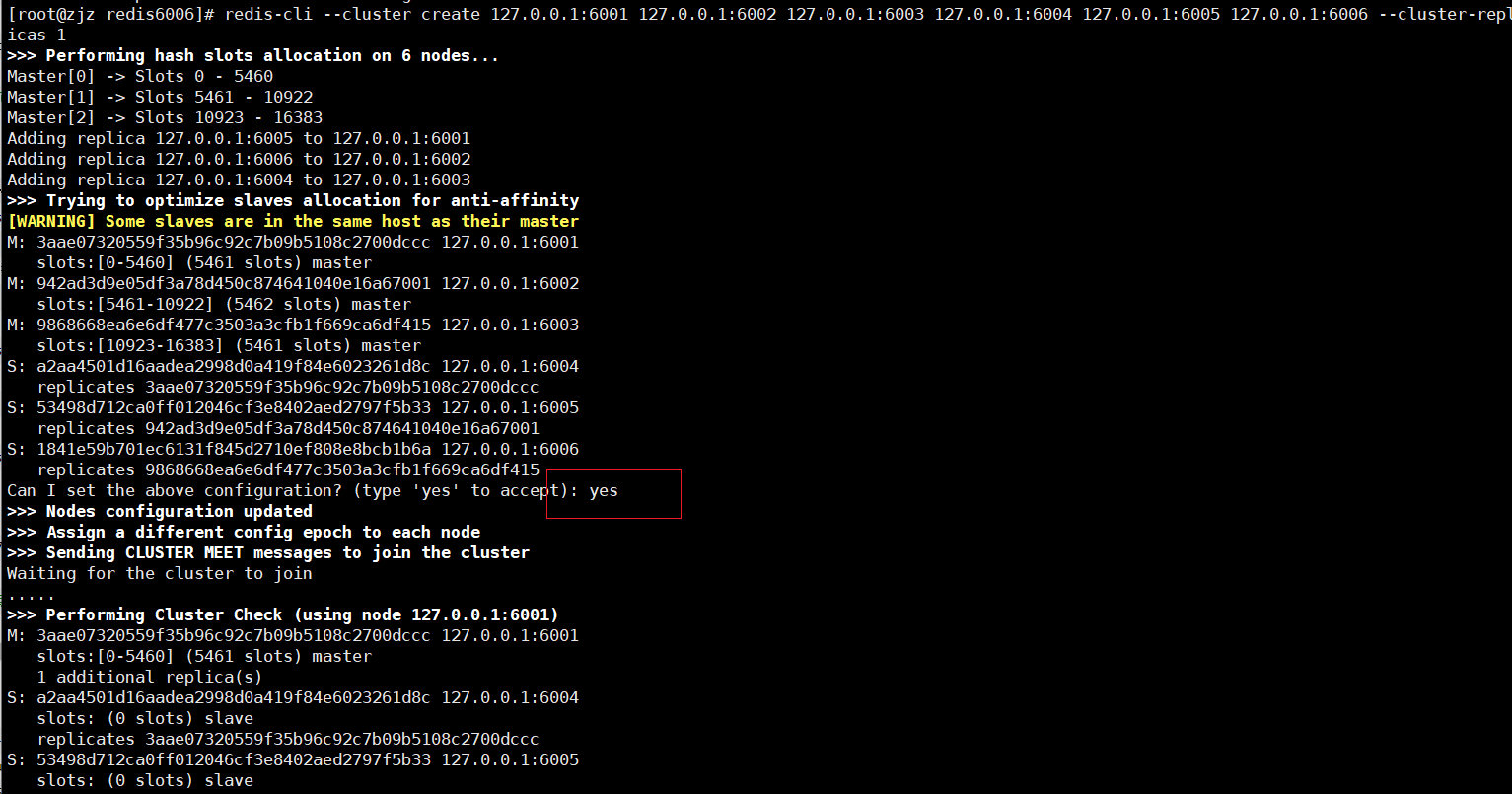 #六个实例分为三组,每组一主一从,前面的做主节点,后面的做从节点。下面交互的时候需要输入yes 才可以创建。